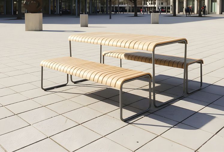 Im städtischen Umfeld überzeugt die LOLA-Bank und der LOLA-Tisch durch ihre weichen Formen und die natürliche Wärme des Holzes. Sie schafft einen einladenden Sitzplatz für alle Generationen.