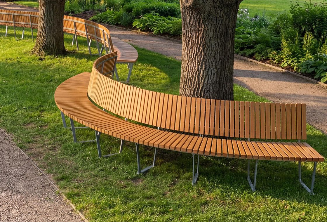 Rundbänke aus Bugholz geben Gärten und Parks, Museen und Restaurants, Altersheimen und Spitälern den letzten Schliff. Holz liegt im Bereich Public Furniture voll im Trend, sei es auf öffentlichen Plätzen, als Parkbank, Hockerbank oder an Haltestellen. Dank der natürlichen Biegsamkeit von Holz fügt sich eine Sitzbank aus Rundholz perfekt in die Architektur von Gebäuden oder in die Landschaftsgestaltung ein: Eine Bogenbank passt immer!