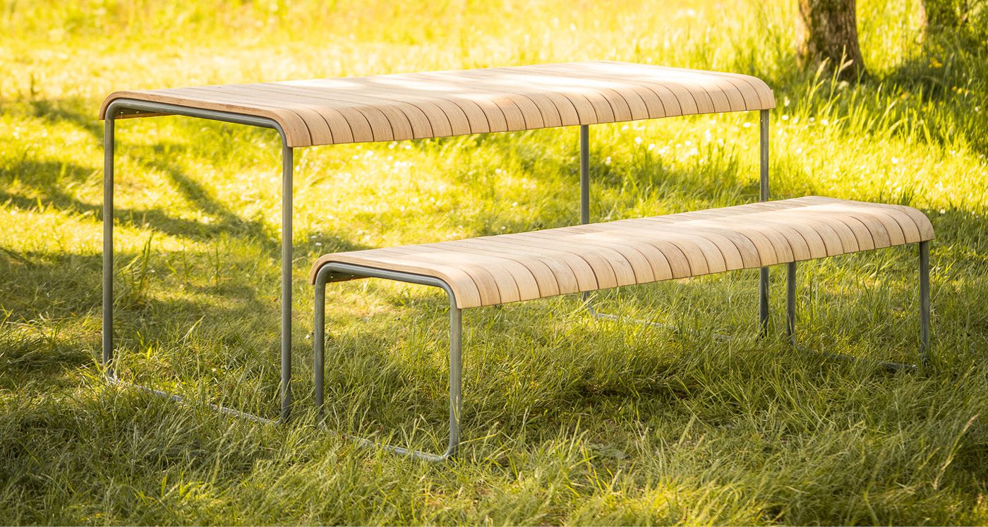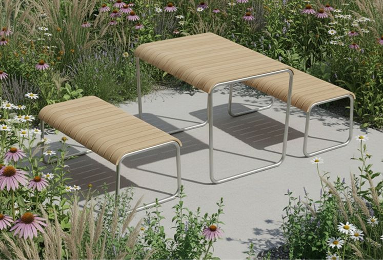 Die LOLA-Tisch-Bank-Kombination bietet privaten Gärten und Terrassen eine moderne Eleganz. Holz und Metall verbinden sich zu einem langlebigen Möbelstück, das Wohnlichkeit nach draussen bringt und den Aussenraum aufwertet.