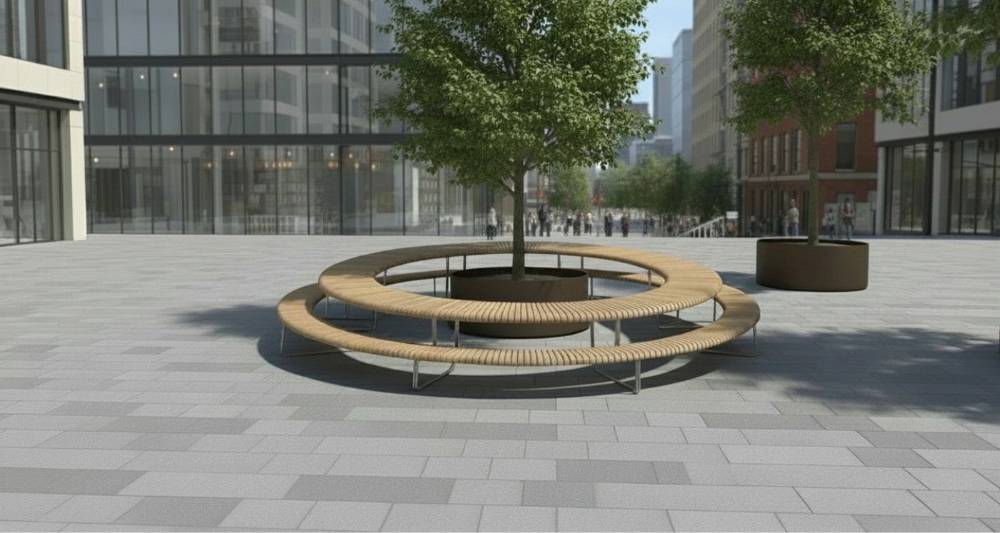 Durch die klare Formensprache und ein minimalistisches Design bietet sie eine moderne Ästhetik, die sich durch Materialität und Geometrie einfach in natürliche Umgebungen integriert. So schafft sie einen einladenden Sitzplatz für alle Generationen.