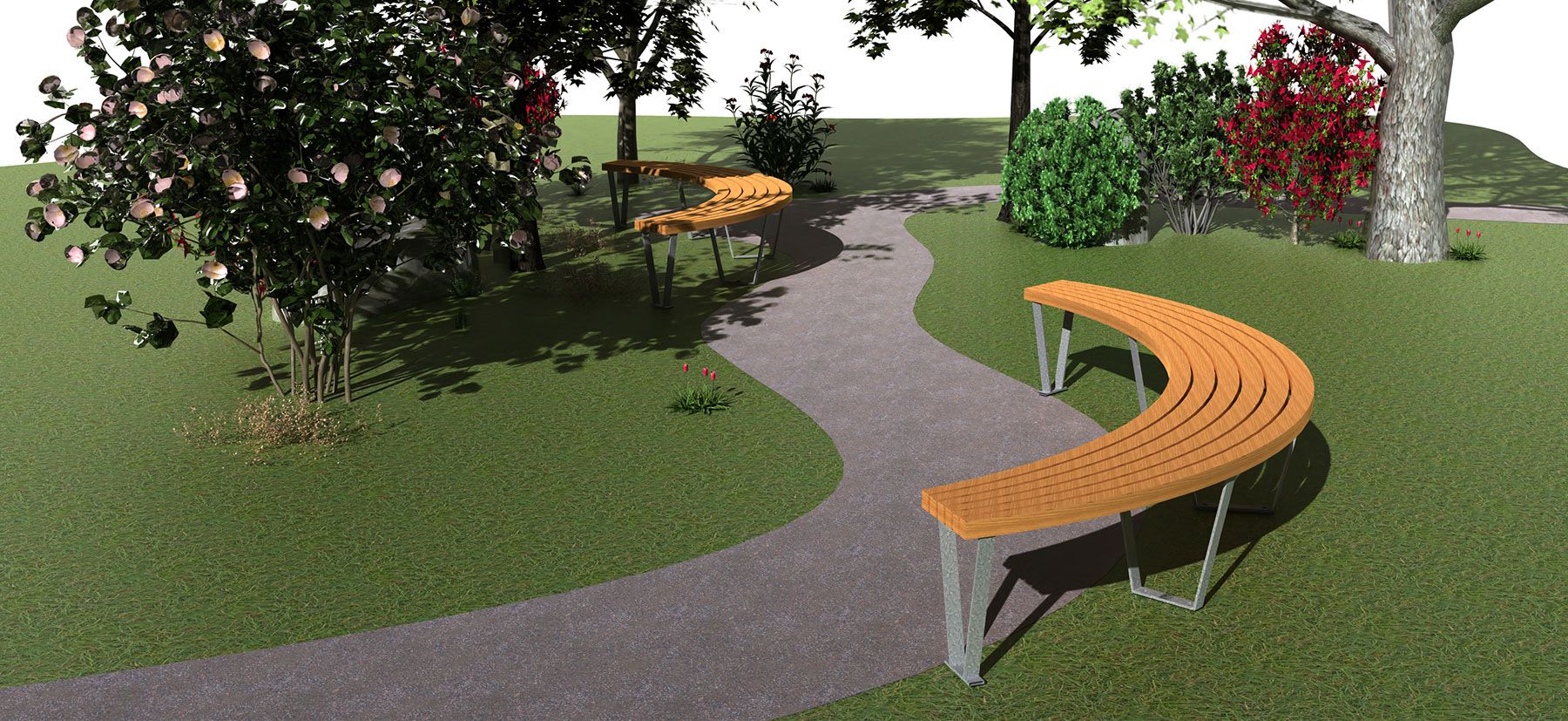 Bien entendu, nous pouvons également adapter la profondeur d'assise du banc aux souhaits du client et aux conditions du paysage en jouant sur l'épaisseur des lattes, le rayon, le segment d'arc choisi et le nombre de lattes.